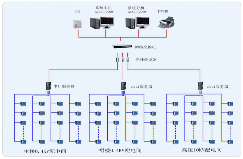 系統(tǒng)采用Acrel-2000型電力監(jiān)控系統(tǒng),整個(gè)系統(tǒng)采用網(wǎng)絡(luò)分布式結(jié)構(gòu),包含主樓0.4KV低壓配電室,裙樓0.4KV低壓配電室,10KV高壓配電室三個(gè)區(qū)域,3個(gè)數(shù)據(jù)采集箱。監(jiān)控主機(jī)位于主樓地下一層的辦公室,監(jiān)控分機(jī)位于主樓一層的消控中心,所有配電回路均配備安科瑞電力儀表PZ系列。該項(xiàng)目實(shí)現(xiàn)了福州郵政廣場2棟樓內(nèi)電力系統(tǒng)的智能管理。所有監(jiān)控設(shè)備均通過屏蔽雙絞線至各自配電室內(nèi)的串口服務(wù)器,再通過光電轉(zhuǎn)換器經(jīng)過光纖將數(shù)據(jù)傳輸至主樓地下一層的辦公室,從而實(shí)現(xiàn)遠(yuǎn)程監(jiān)控。