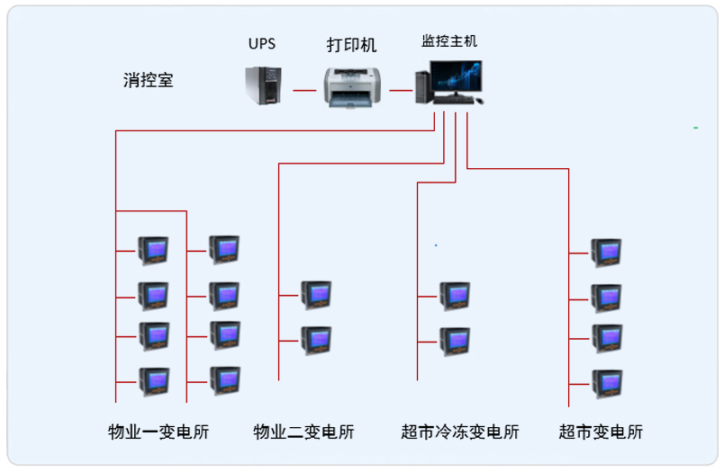 系統(tǒng)采用Acrel-2000型電力監(jiān)控系統(tǒng),整個系統(tǒng)采用網(wǎng)絡(luò)分布式結(jié)構(gòu),監(jiān)控主機(jī)位于消防監(jiān)控室中,其他4個配電室分別位于地下一層。該項(xiàng)目實(shí)現(xiàn)了湖州萬達(dá)4個10kV變電所的智能管理。所有監(jiān)控設(shè)備均通過屏蔽雙絞線至后臺監(jiān)控主機(jī),從而實(shí)現(xiàn)遠(yuǎn)程監(jiān)控。