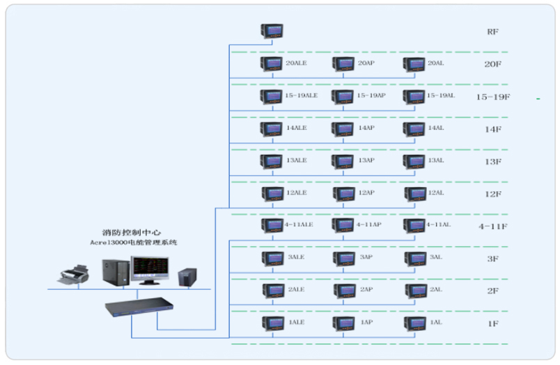 我司本項目承接其樓層部分電能管理系統(tǒng)搭建,完成對配電回路用電的實時監(jiān)控和管理。該項目進(jìn)出線回路均采用ACR多功能液晶顯示儀表,其是針對電力系統(tǒng)、公共設(shè)施、智能大廈的電力監(jiān)控需求而設(shè)計的網(wǎng)絡(luò)電力儀表,它能測量所有常規(guī)電力參數(shù),如:三相電壓、電流、有功功率、無功功率、功率因數(shù)、頻率、有功電度、無功電度。現(xiàn)場儀表以手拉手方式通過屏蔽雙絞線(RVVSP2*1.0)進(jìn)行通訊連接,每根總線連接智能儀表數(shù)量在20只左右,不同種類的智能裝置連接在不同的總線上,然后將數(shù)據(jù)上傳至數(shù)據(jù)采集器,進(jìn)而將數(shù)據(jù)上傳至當(dāng)?shù)乇O(jiān)控終端。
