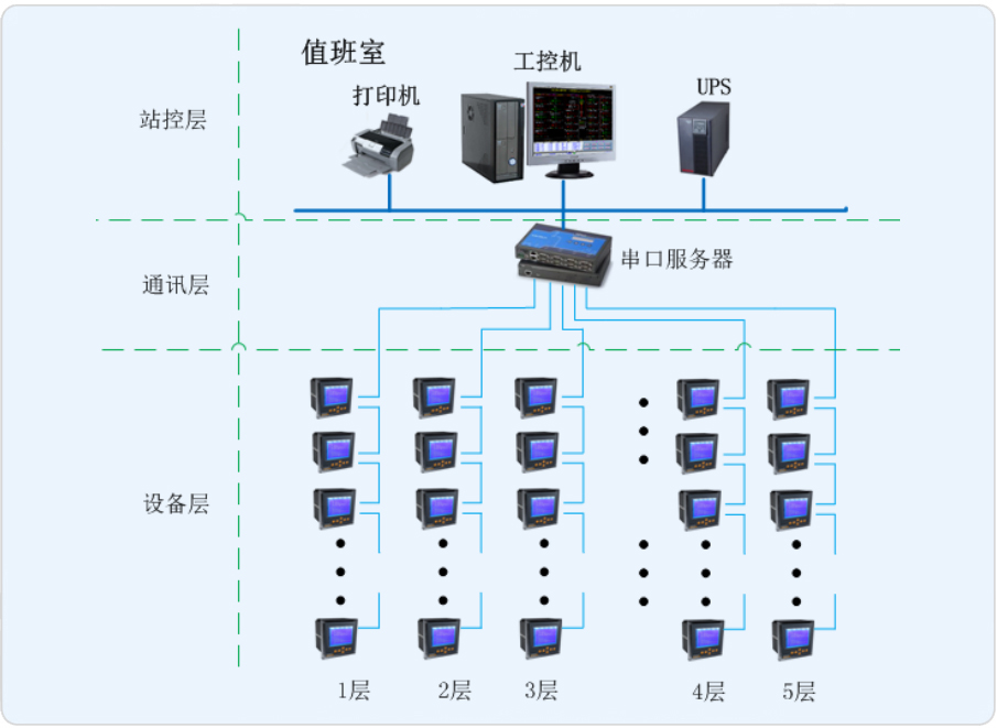 本項(xiàng)目是為羅店鎮(zhèn)市民服務(wù)中心樓層配電部分設(shè)計(jì)的電能管理系統(tǒng),監(jiān)控范圍為8層樓內(nèi)的多功能儀表。現(xiàn)場多功能儀表通過總線接入值班室采集器,再將通過采集器連接到監(jiān)控主機(jī),從而在監(jiān)控主機(jī)上實(shí)現(xiàn)總線上儀表與監(jiān)控主機(jī)的數(shù)據(jù)連通。通過Acrel-3000電能管理系統(tǒng)對(duì)樓層用電環(huán)節(jié)進(jìn)行記錄與統(tǒng)計(jì),借助計(jì)算機(jī)輔助手段進(jìn)行集抄,節(jié)省人工成本。