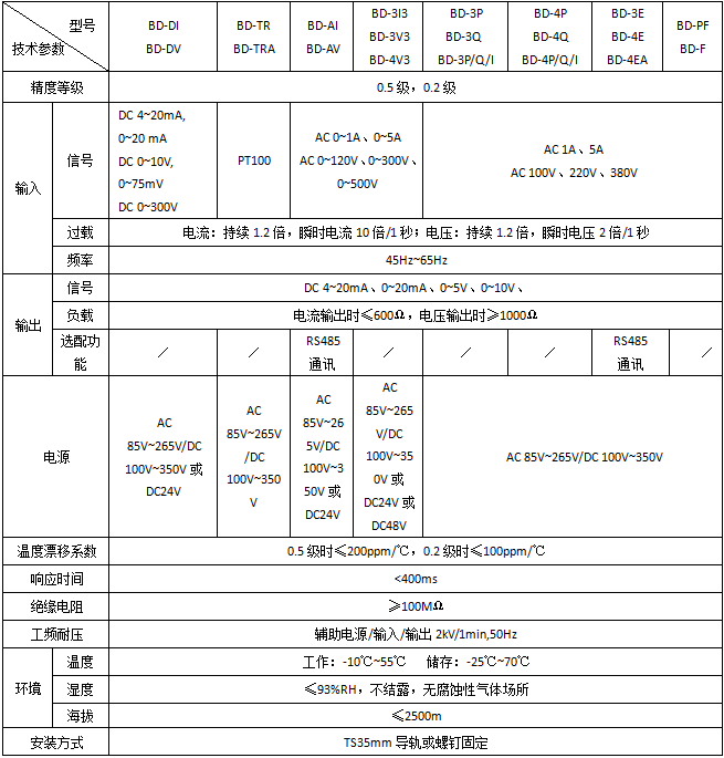 | 電壓變送器 | BD-AV | 測(cè)量單相交流電壓,隔離變送輸出4-20mA或0-5V DC信號(hào) | RS485-MODBUS |