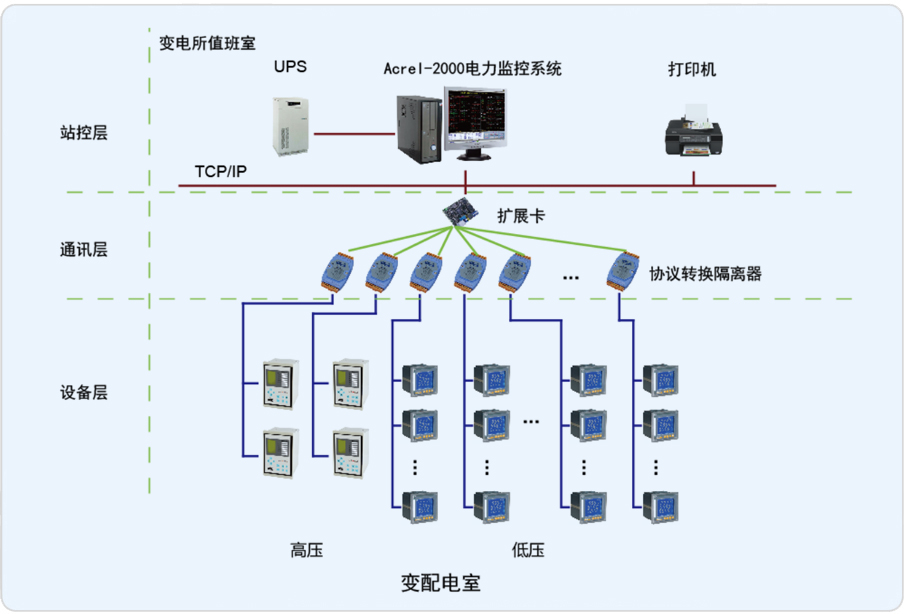 本項目承接其10KV配電增容改造變電所部分電力監(jiān)控系統(tǒng),其中有兩路高壓進(jìn)線,配有綜合保護(hù)裝置,低壓部分,進(jìn)線柜、饋線柜配有儀表。通過Acrel-2000電力監(jiān)控系統(tǒng),實時監(jiān)測變電所內(nèi)各個回路的電流、電壓、功率、開關(guān)狀態(tài)等電參量,由此達(dá)到變電所少人值守或無人值守的智能化管理。